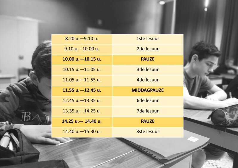De school is elke weekdag open van 7.50 uur tot 16.40 uur. Op woensdag is de school open tot 12.10 uur.